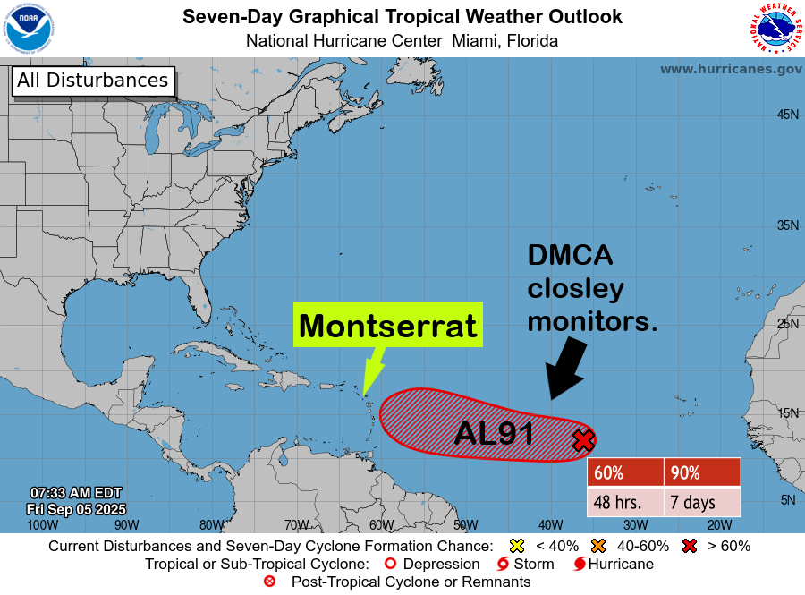 The Disaster Management Coordination Agency (DMCA) continues to monitor a tropical disturbance over the eastern tropical North Atlantic, now officially classified as Invest 91L (AL91). The system has a medium (60%) chance of development within 48 hours and a high (90%) likelihood over the next 7 days of becoming a tropical depression or storm.